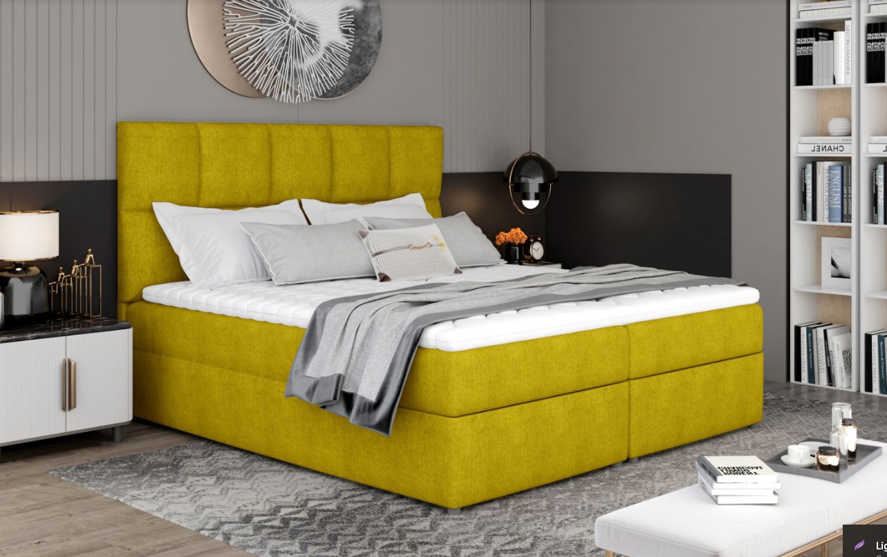 Postel boxspring Glossy s velkým úložným prostorem na první pohled zaujme elegantním designem. Postel je vyrobena v kombinací dřeva a dřevotřísky s pěkným čalouněním z přijemného materiálu. Postel disponuje několika vkusnými doplňky jako je prošívané čelo či kovové nožky. Pro dosažení optimálního pohodlí byla použita 15 cm vysoká oboustranná pružinová matrace typu bonnel, která je vybavena z každé strany vrstvou PUR pěny T25+pružina. Tvrdost matrace H3 má potah na zip, který je pratelný na 40 st. Pro lepší pohodlí je vrchní část postele doplněna o podložku z pěny, která je vysoká 4 cm. Postel má dva úložné prostory na lůžkoviny. Boxspring zajišťuje dokonalou cirkulaci vzduchu a odvádí tak většinu vlhkosti mimo lůžko. Potahová látka jako na hlavní fotografii - žlutá látka. Na výběr máte z mnoha barevných variant. Maximální nosnost jedné postele 110 kg. Zboží dodáváme v demontu.