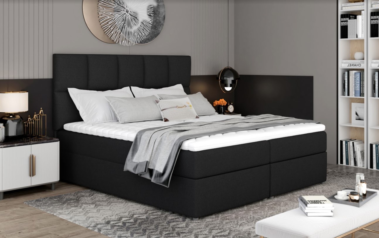 Postel boxspring Glossy s velkým úložným prostorem na první pohled zaujme elegantním designem. Postel je vyrobena v kombinací dřeva a dřevotřísky s pěkným čalouněním z přijemného materiálu. Postel disponuje několika vkusnými doplňky jako je prošívané čelo či kovové nožky. Pro dosažení optimálního pohodlí byla použita 15 cm vysoká oboustranná pružinová matrace typu bonnel, která je vybavena z každé strany vrstvou PUR pěny T25+pružina. Tvrdost matrace H3 má potah na zip, který je pratelný na 40 st. Pro lepší pohodlí je vrchní část postele doplněna o podložku z pěny, která je vysoká 4 cm. Postel má dva úložné prostory na lůžkoviny. Boxspring zajišťuje dokonalou cirkulaci vzduchu a odvádí tak většinu vlhkosti mimo lůžko. Potahová látka jako na hlavní fotografii - černá látka. Na výběr máte z mnoha barevných variant. Maximální nosnost jedné postele 110 kg. Zboží dodáváme v demontu.