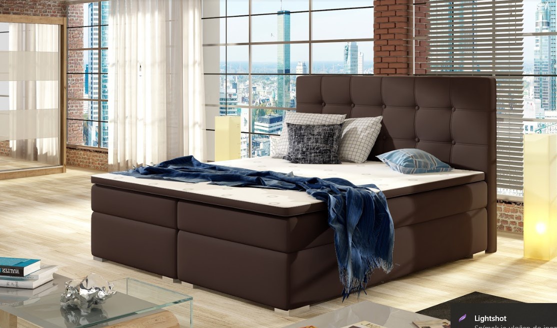 Elegantní postel INEZ disponuje vysokým, prošívaným čelem s knoflíky. Postel zdobí plastové nohy ve stříbrném dezénu. Pro dosažení optimálního pohodlí byla použita 20 cm vysoká pružinová matrace typu bonnel, která je vybavena z každé strany vrstvou PUR pěny T25. Pro lepší pohodlí je vrchní část postele doplněna o 4 cm podložku z pěny T21. Potahová látka jako na hlavním obrázku - tmavohnědá eko kůže. Postel boxspring není určena do prostoru, nemá očalouněná záda (očalounění zad za příplatek, na dotaz). Nosnost max 110 kg.