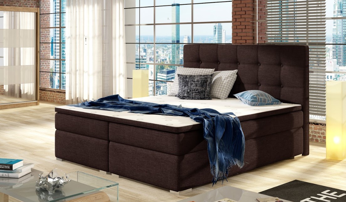 Elegantní postel INEZ disponuje vysokým, prošívaným čelem s knoflíky. Postel zdobí plastové nohy ve stříbrném dezénu. Pro dosažení optimálního pohodlí byla použita 20 cm vysoká pružinová matrace typu bonnel, která je vybavena z každé strany vrstvou PUR pěny T25. Pro lepší pohodlí je vrchní část postele doplněna o 4 cm podložku z pěny T21. Postel boxspring není určena do prostoru, nemá očalouněná záda (očalounění zad za příplatek, na dotaz). Potahová látka jako na hlavním obrázku - tmavohnědá. Nosnost max 110 kg.