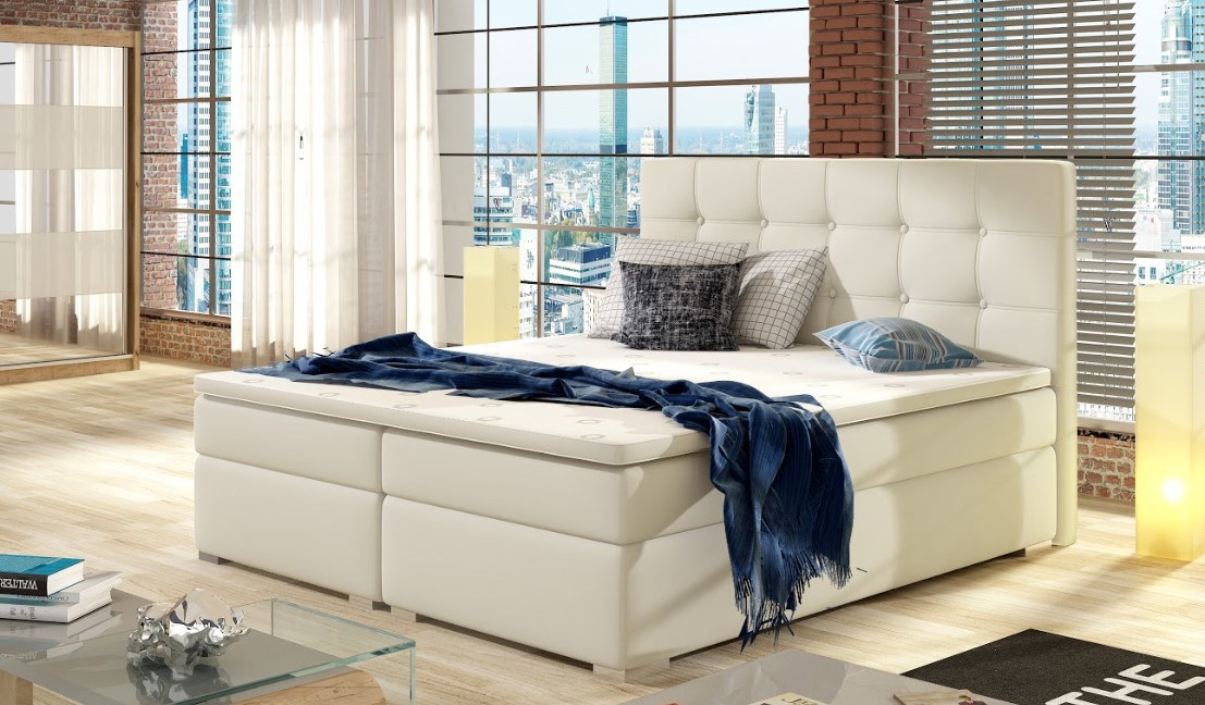 Elegantní postel INEZ disponuje vysokým, prošívaným čelem s knoflíky. Postel zdobí plastové nohy ve stříbrném dezénu. Pro dosažení optimálního pohodlí byla použita 20 cm vysoká pružinová matrace typu bonnel, která je vybavena z každé strany vrstvou PUR pěny T25. Pro lepší pohodlí je vrchní část postele doplněna o 4 cm podložku z pěny T21. Potahová látka jako na hlavním obrázku - krémová eko kůže. Postel boxspring není určena do prostoru, nemá očalouněná záda (očalounění zad za příplatek, na dotaz). Nosnost max 110 kg.
