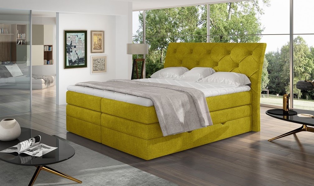 Postel Boxspring má moderní design, který zajišťuje velké pohodlí a dobrý noční spánek. Model Mirabel je postel s vestavěnou bonnelovou matrací s vlastnostmi tlumícími nárazy v dezénu Omega 68 (žlutá). Dále na ni byla umístěna kapesní matrace a topper z pěny T3030, což eliminuje nepříjemnou mezeru ve středu postele a vytváří měkký, hladký povrch na spaní. Toto řešení zajišťuje vynikající propustnost vzduchu a vysokou hygienu. Postel je 60 cm nad zemí, takže je vstávání pohodlné a bez námahy. Prošívaná čelní deska je dekorativní prvek, protože vypadá velmi stylově, ale zároveň slouží jako prostorné opěradlo. Díky dvojité nádobě na ložní prádlo se stává mimořádně praktickou a místo materiálových úchytů pro zvedání nádoby se používají prohlubně pro ruce, navíc je při zvedání podepřena plynovým zvedákem. Postel je k dispozici ve třech velikostech. Spací plocha 140 x 200 cm. Zboží dodáváme v demontu.