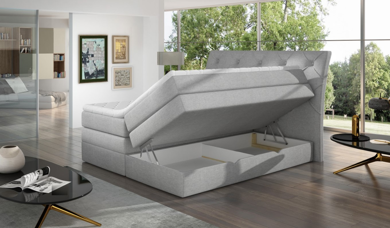 Postel Boxspring má moderní design, který zajišťuje velké pohodlí a dobrý noční spánek. Model Mirabel je postel s vestavěnou bonnelovou matrací s vlastnostmi tlumícími nárazy v dezénu Kronos 19 (zelená). Dále na ni byla umístěna kapesní matrace a topper z pěny T3030, což eliminuje nepříjemnou mezeru ve středu postele a vytváří měkký, hladký povrch na spaní. Toto řešení zajišťuje vynikající propustnost vzduchu a vysokou hygienu. Postel je 60 cm nad zemí, takže je vstávání pohodlné a bez námahy. Prošívaná čelní deska je dekorativní prvek, protože vypadá velmi stylově, ale zároveň slouží jako prostorné opěradlo. Díky dvojité nádobě na ložní prádlo se stává mimořádně praktickou a místo materiálových úchytů pro zvedání nádoby se používají prohlubně pro ruce, navíc je při zvedání podepřena plynovým zvedákem. Postel je k dispozici ve třech velikostech. Spací plocha 160 x 200 cm. Zboží dodáváme v demontu.