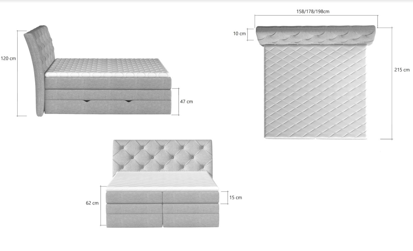 Postel Boxspring má moderní design, který zajišťuje velké pohodlí a dobrý noční spánek. Model Mirabel je postel s vestavěnou bonnelovou matrací s vlastnostmi tlumícími nárazy v dezénu Sawana 05 (tmavě šedá). Dále na ni byla umístěna kapesní matrace a topper z pěny T3030, což eliminuje nepříjemnou mezeru ve středu postele a vytváří měkký, hladký povrch na spaní. Toto řešení zajišťuje vynikající propustnost vzduchu a vysokou hygienu. Postel je 60 cm nad zemí, takže je vstávání pohodlné a bez námahy. Prošívaná čelní deska je dekorativní prvek, protože vypadá velmi stylově, ale zároveň slouží jako prostorné opěradlo. Díky dvojité nádobě na ložní prádlo se stává mimořádně praktickou a místo materiálových úchytů pro zvedání nádoby se používají prohlubně pro ruce, navíc je při zvedání podepřena plynovým zvedákem. Postel je k dispozici ve třech velikostech. Spací plocha 160 x 200 cm. Zboží dodáváme v demontu.