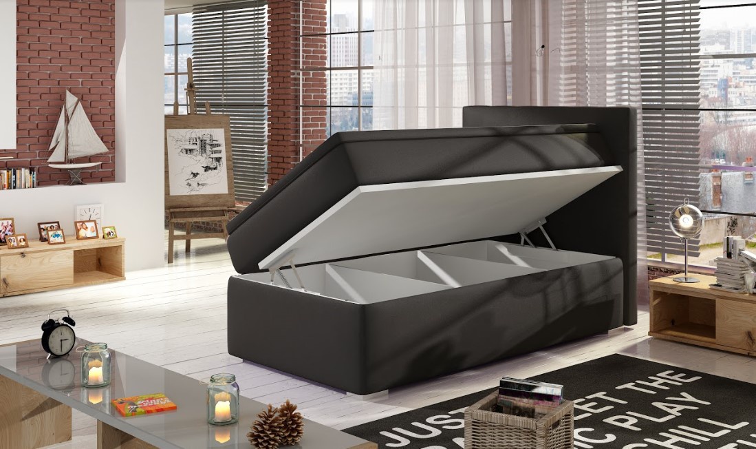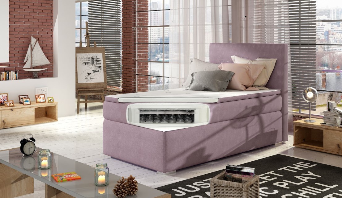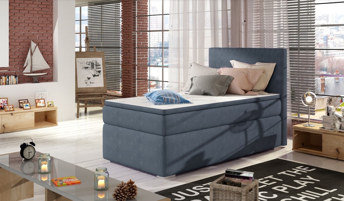 Jednoduchá, ale přitom originální postel je vhodná do menších ložnic a dětských pokojů. Je vhodná pro jednu osobu. Postel disponuje vysokou matrací, čalouněným rámem a vysokým čelem. Pro dosažení optimálního pohodlí byla použita 20 cm vysoká pružinová matrace typu bonnel, která je vybavena z každé strany vrstvou PUR pěny T25. Maximální komfort zajistí druhá vrstva, přistýlka o výšce 4 cm. Otevírání úložného prostoru lze vybrat z pravé či levé strany. Potahová látka jako na hlavní fotografii - modrá látka. Maximální nosnost postele 110 kg.