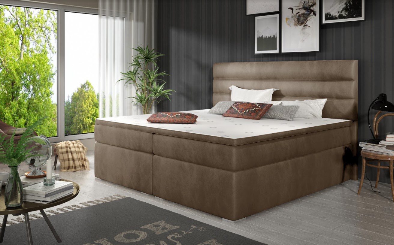 Postel boxspring Softy s úložným prostorem na první pohled zaujme elegantním designem. Lůžko disponuje několika vkusnými doplňky jako je prošívané čelo či kovové nožky. Pro dosažení optimálního pohodlí byla použita 25 cm vysoká oboustranná pružinová matrace typu bonnel, která je vybavena z každé strany vrstvou PUR pěny T2542+pružina. Tvrdost matrace H3 má hypoalergenní potah na zip. Pro lepší pohodlí je vrchní část postele doplněna o podložku z pěny. Postel má dva úložné prostory na lůžkoviny. Boxspring zajišťuje dokonalou cirkulaci vzduchu a odvádí tak většinu vlhkosti mimo lůžko. Potahová látka jako na hlavní fotografii - světle hnědá látka. Maximální nosnost jedné postele 110 kg. Zboží dodáváme v demontu.