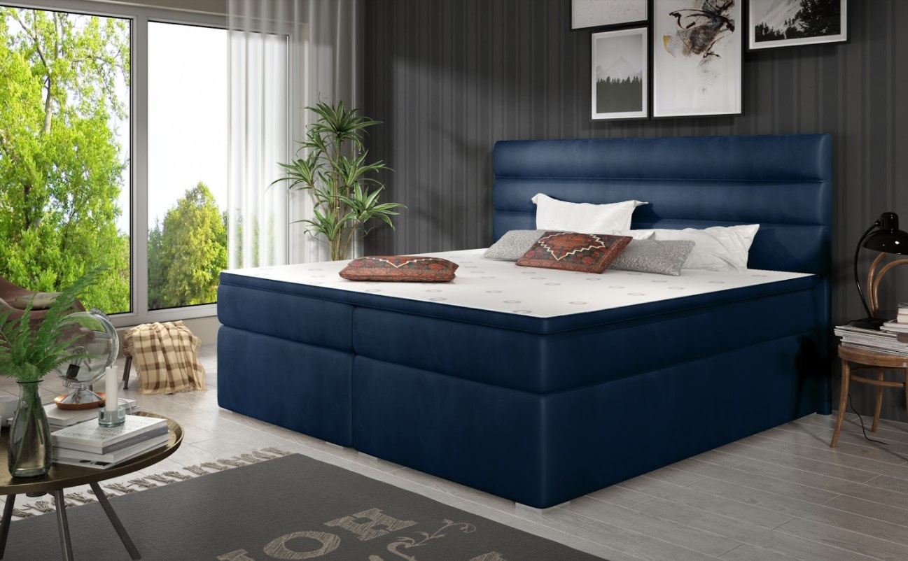 Postel boxspring Softy s úložným prostorem na první pohled zaujme elegantním designem. Lůžko disponuje několika vkusnými doplňky jako je prošívané čelo či kovové nožky. Pro dosažení optimálního pohodlí byla použita 25 cm vysoká oboustranná pružinová matrace typu bonnel, která je vybavena z každé strany vrstvou PUR pěny T2542+pružina. Tvrdost matrace H3 má hypoalergenní potah na zip. Pro lepší pohodlí je vrchní část postele doplněna o podložku z pěny. Postel má dva úložné prostory na lůžkoviny. Boxspring zajišťuje dokonalou cirkulaci vzduchu a odvádí tak většinu vlhkosti mimo lůžko. Potahová látka jako na hlavní fotografii - tmavě modrá látka. Maximální nosnost jedné postele 110 kg. Zboží dodáváme v demontu.