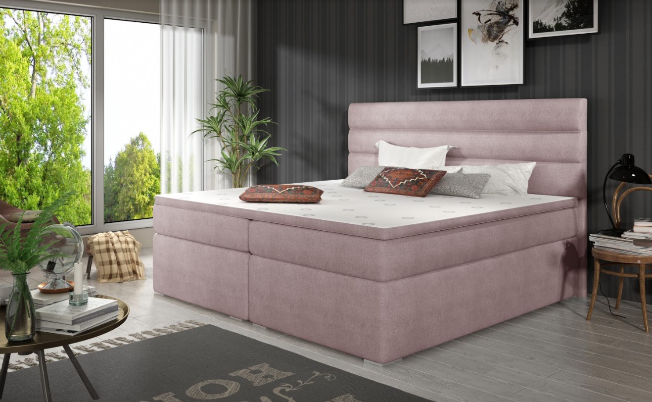 Postel boxspring Softy s úložným prostorem na první pohled zaujme elegantním designem. Lůžko disponuje několika vkusnými doplňky jako je prošívané čelo či kovové nožky. Pro dosažení optimálního pohodlí byla použita 25 cm vysoká oboustranná pružinová matrace typu bonnel, která je vybavena z každé strany vrstvou PUR pěny T2542+pružina. Tvrdost matrace H3 má hypoalergenní potah na zip. Pro lepší pohodlí je vrchní část postele doplněna o podložku z pěny. Postel má dva úložné prostory na lůžkoviny. Boxspring zajišťuje dokonalou cirkulaci vzduchu a odvádí tak většinu vlhkosti mimo lůžko. Potahová látka jako na hlavní fotografii - světle růžová látka. Maximální nosnost jedné postele 110 kg. Zboží dodáváme v demontu.