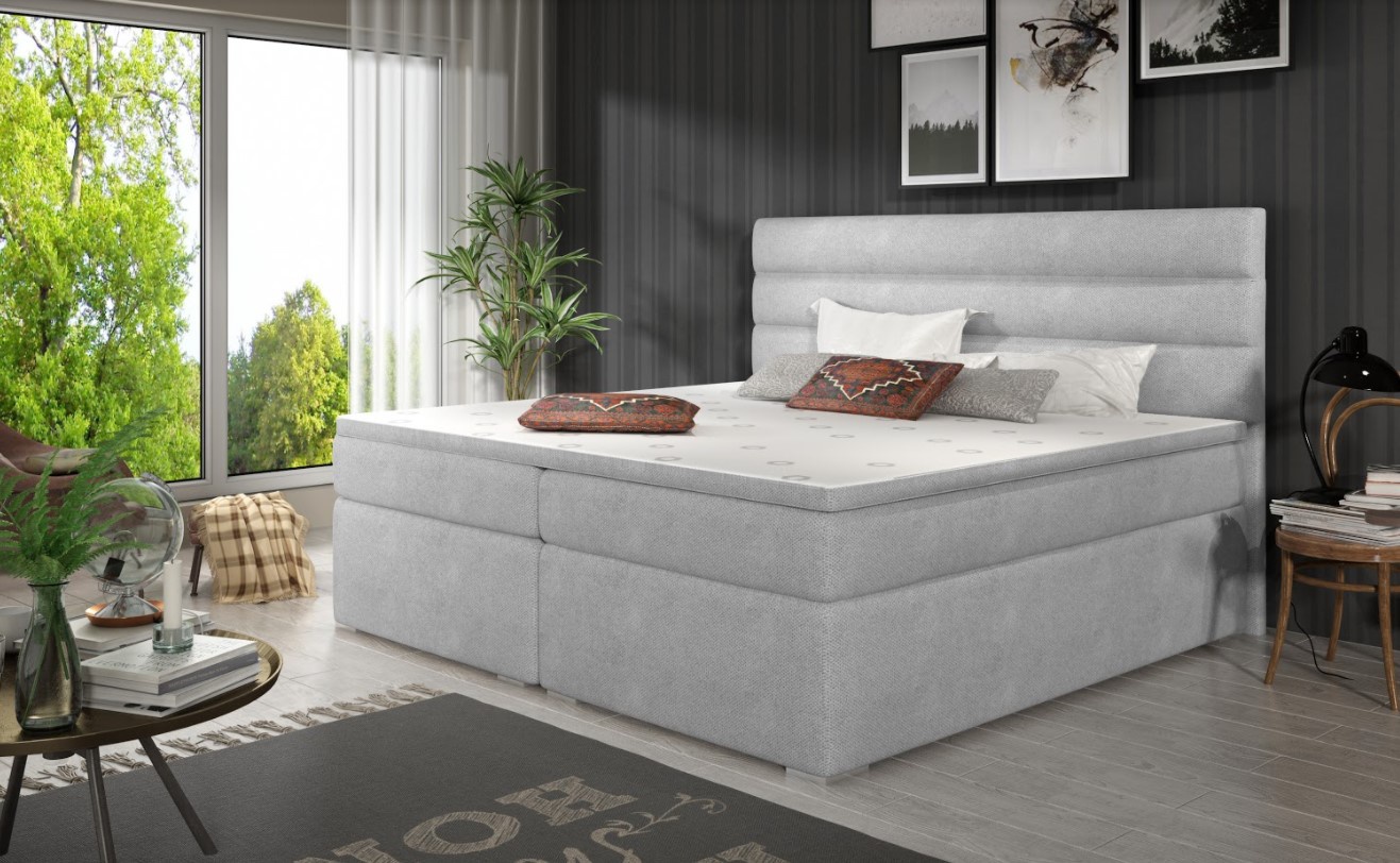 Postel boxspring Softy s úložným prostorem na první pohled zaujme elegantním designem. Lůžko disponuje několika vkusnými doplňky jako je prošívané čelo či kovové nožky. Pro dosažení optimálního pohodlí byla použita 25 cm vysoká oboustranná pružinová matrace typu bonnel, která je vybavena z každé strany vrstvou PUR pěny T2542+pružina. Tvrdost matrace H3 má hypoalergenní potah na zip. Pro lepší pohodlí je vrchní část postele doplněna o podložku z pěny. Postel má dva úložné prostory na lůžkoviny. Boxspring zajišťuje dokonalou cirkulaci vzduchu a odvádí tak většinu vlhkosti mimo lůžko. Potahová látka jako na hlavní fotografii - světle šedá látka. Maximální nosnost jedné postele 110 kg. Zboží dodáváme v demontu.