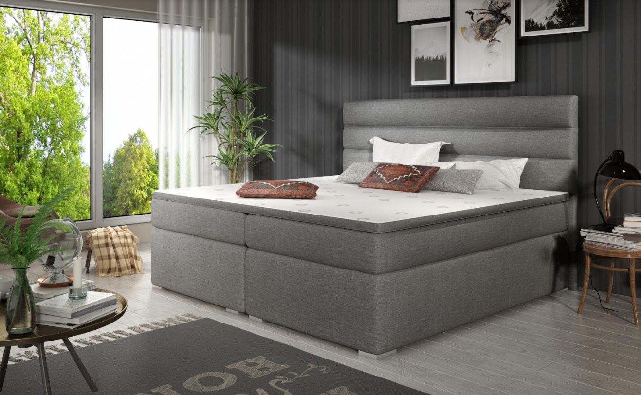Postel boxspring Softy s úložným prostorem na první pohled zaujme elegantním designem. Lůžko disponuje několika vkusnými doplňky jako je prošívané čelo či kovové nožky. Pro dosažení optimálního pohodlí byla použita 25 cm vysoká oboustranná pružinová matrace typu bonnel, která je vybavena z každé strany vrstvou PUR pěny T2542+pružina. Tvrdost matrace H3 má hypoalergenní potah na zip. Pro lepší pohodlí je vrchní část postele doplněna o podložku z pěny. Postel má dva úložné prostory na lůžkoviny. Boxspring zajišťuje dokonalou cirkulaci vzduchu a odvádí tak většinu vlhkosti mimo lůžko. Potahová látka jako na hlavní fotografii - tmavě šedá látka. Maximální nosnost jedné postele 110 kg. Zboží dodáváme v demontu.
