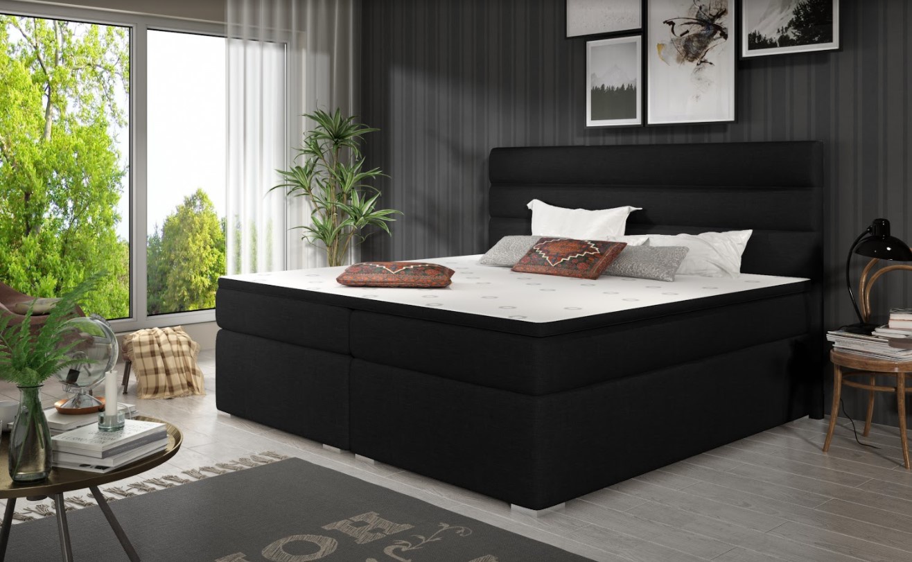 Postel boxspring Softy s úložným prostorem na první pohled zaujme elegantním designem. Lůžko disponuje několika vkusnými doplňky jako je prošívané čelo či kovové nožky. Pro dosažení optimálního pohodlí byla použita 25 cm vysoká oboustranná pružinová matrace typu bonnel, která je vybavena z každé strany vrstvou PUR pěny T2542+pružina. Tvrdost matrace H3 má hypoalergenní potah na zip. Pro lepší pohodlí je vrchní část postele doplněna o podložku z pěny. Postel má dva úložné prostory na lůžkoviny. Boxspring zajišťuje dokonalou cirkulaci vzduchu a odvádí tak většinu vlhkosti mimo lůžko. Potahová látka jako na hlavní fotografii - černá látka. Maximální nosnost jedné postele 110 kg. Zboží dodáváme v demontu.