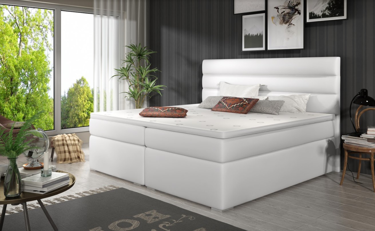 Postel boxspring Softy s úložným prostorem na první pohled zaujme elegantním designem. Lůžko disponuje několika vkusnými doplňky jako je prošívané čelo či kovové nožky. Pro dosažení optimálního pohodlí byla použita 25 cm vysoká oboustranná pružinová matrace typu bonnel, která je vybavena z každé strany vrstvou PUR pěny T2542+pružina. Tvrdost matrace H3 má hypoalergenní potah na zip. Pro lepší pohodlí je vrchní část postele doplněna o podložku z pěny. Postel má dva úložné prostory na lůžkoviny. Boxspring zajišťuje dokonalou cirkulaci vzduchu a odvádí tak většinu vlhkosti mimo lůžko. Potahová látka jako na hlavní fotografii - bílá látka. Maximální nosnost jedné postele 110 kg. Zboží dodáváme v demontu.