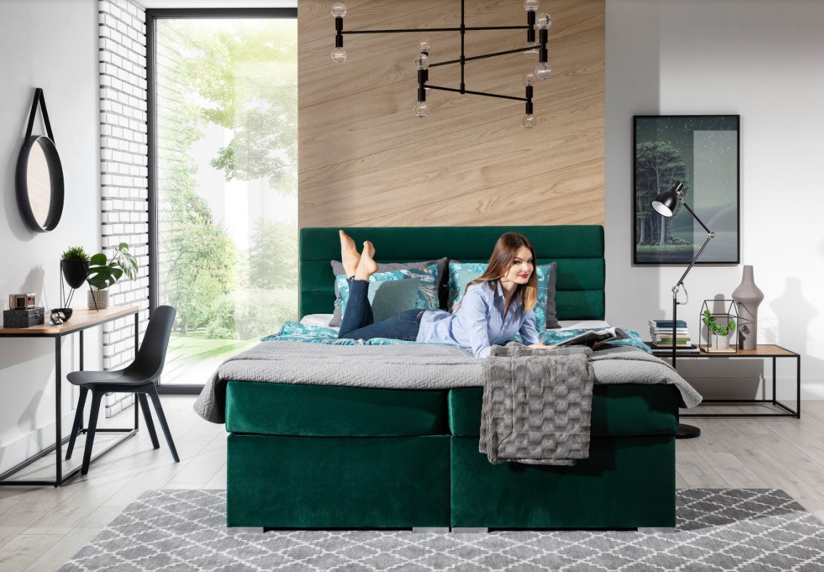 Postel boxspring Softy s úložným prostorem na první pohled zaujme elegantním designem. Lůžko disponuje několika vkusnými doplňky jako je prošívané čelo či kovové nožky. Pro dosažení optimálního pohodlí byla použita 25 cm vysoká oboustranná pružinová matrace typu bonnel, která je vybavena z každé strany vrstvou PUR pěny T2542+pružina. Tvrdost matrace H3 má hypoalergenní potah na zip. Pro lepší pohodlí je vrchní část postele doplněna o podložku z pěny. Postel má dva úložné prostory na lůžkoviny. Boxspring zajišťuje dokonalou cirkulaci vzduchu a odvádí tak většinu vlhkosti mimo lůžko. Potahová látka jako na hlavní fotografii - tmavě zelená látka. Maximální nosnost jedné postele 110 kg. Zboží dodáváme v demontu.