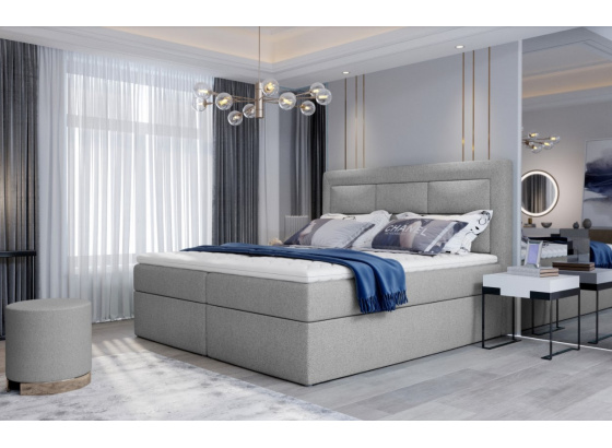 Moderní manželská čalouněná postel boxspring má vysoké originálně prošité čelo. Postel je upevněna na pevné dřevěné krabici s matrací s bonnelovými pružinami a výplň T25 pěnou. Celá postel je pokryta topperem, který eliminuje nepříjemné přerušení uprostřed postele a také zvyšuje pocit pohodlí. Potah topperu je pratelný na 40 st. a je vyrobený z hypoalergenního materiálu. Postel nabízí velký úložný prostor, který se otevírá ze stran postele. Potahová látka jako na hlavní fotografii.