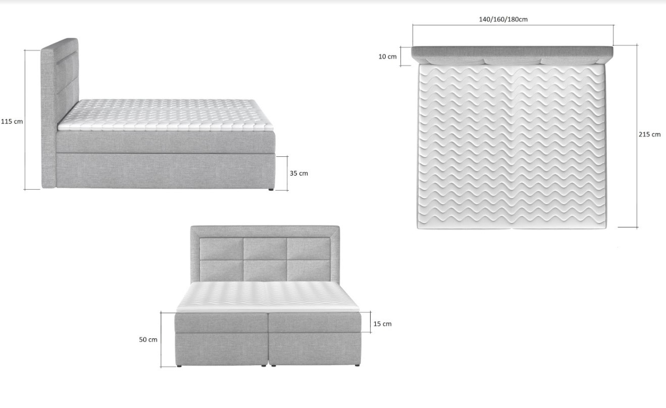 Moderní manželská čalouněná postel boxspring má vysoké originálně prošité čelo. Postel je upevněna na pevné dřevěné krabici s matrací s bonnelovými pružinami a výplň T25 pěnou. Celá postel je pokryta topperem, který eliminuje nepříjemné přerušení uprostřed postele a také zvyšuje pocit pohodlí. Potah topperu je pratelný na 40 st. a je vyrobený z hypoalergenního materiálu. Postel nabízí velký úložný prostor, který se otevírá ze stran postele. Potahová látka jako na hlavní fotografii.