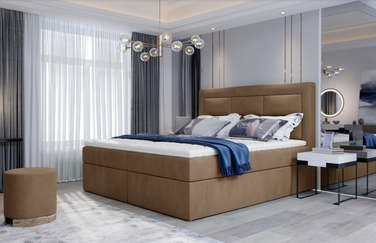 Moderní manželská čalouněná postel boxspring má vysoké originálně prošité čelo. Postel je upevněna na pevné dřevěné krabici s matrací s bonnelovými pružinami a výplň T25 pěnou. Celá postel je pokryta topperem, který eliminuje nepříjemné přerušení uprostřed postele a také zvyšuje pocit pohodlí. Potah topperu je pratelný na 40 st. a je vyrobený z hypoalergenního materiálu. Postel nabízí velký úložný prostor, který se otevírá ze stran postele. Potahová látka jako na hlavní fotografii.