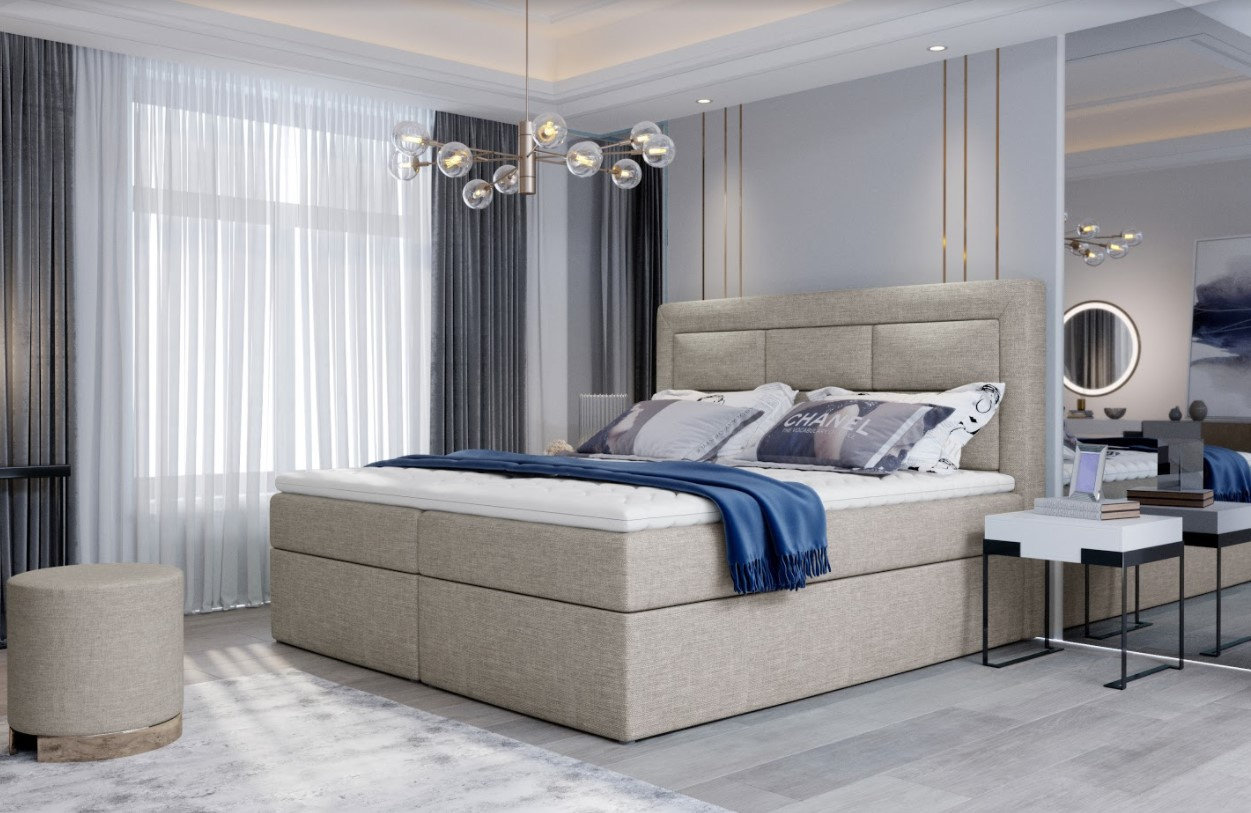 Moderní manželská čalouněná postel boxspring má vysoké originálně prošité čelo. Postel je upevněna na pevné dřevěné krabici s matrací s bonnelovými pružinami a výplň T25 pěnou. Celá postel je pokryta topperem, který eliminuje nepříjemné přerušení uprostřed postele a také zvyšuje pocit pohodlí. Potah topperu je pratelný na 40 st. a je vyrobený z hypoalergenního materiálu. Postel nabízí velký úložný prostor, který se otevírá ze stran postele. Potahová látka jako na hlavní fotografii.