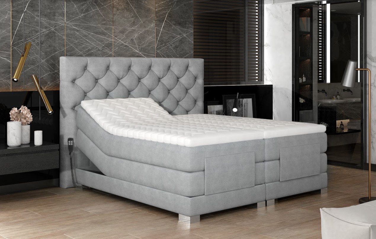 Kontinentální postel Clover s elektrickým ovládáním v dezénu Grande 81 (světle šedá) je novým řešením pro lidi, kteří si cení pohodlí na nejvyšší úrovni. Elektrické nastavení umožňuje přizpůsobit výšku matrací individuálním potřebám. Nastavení výšky hlavy a nohou zvyšuje pohodlí a praktičnost celé postele. Nastavitelná postel Clover má tři samostatné matrace pěna T2542+ bonnell, které vytvářejí prostorný prostor na spaní vysoko nad zemí a poskytují vám pohodlí při každodenním vstávání. Matrace jsou ovládány 2 dálkovými ovladači umístěnými na obou stranách postele. Boxspring Clover se stabilizuje na chromovaných nohách, díky čemuž postel vypadá velmi působivě. Tiché a plynulé zvedání zad a nohou praktickým dálkovým ovládáním zaručuje relaxační odpočinek a hluboký spánek. Odolný rám je zcela potažen čalounickou látkou. Vysoké, měkké čelo postele s pravidelným prošíváním vypadá elegantně a moderně a navíc zakrývá zeď. Spací plocha 160 x 200 cm. Zboží dodáváme v demontu.