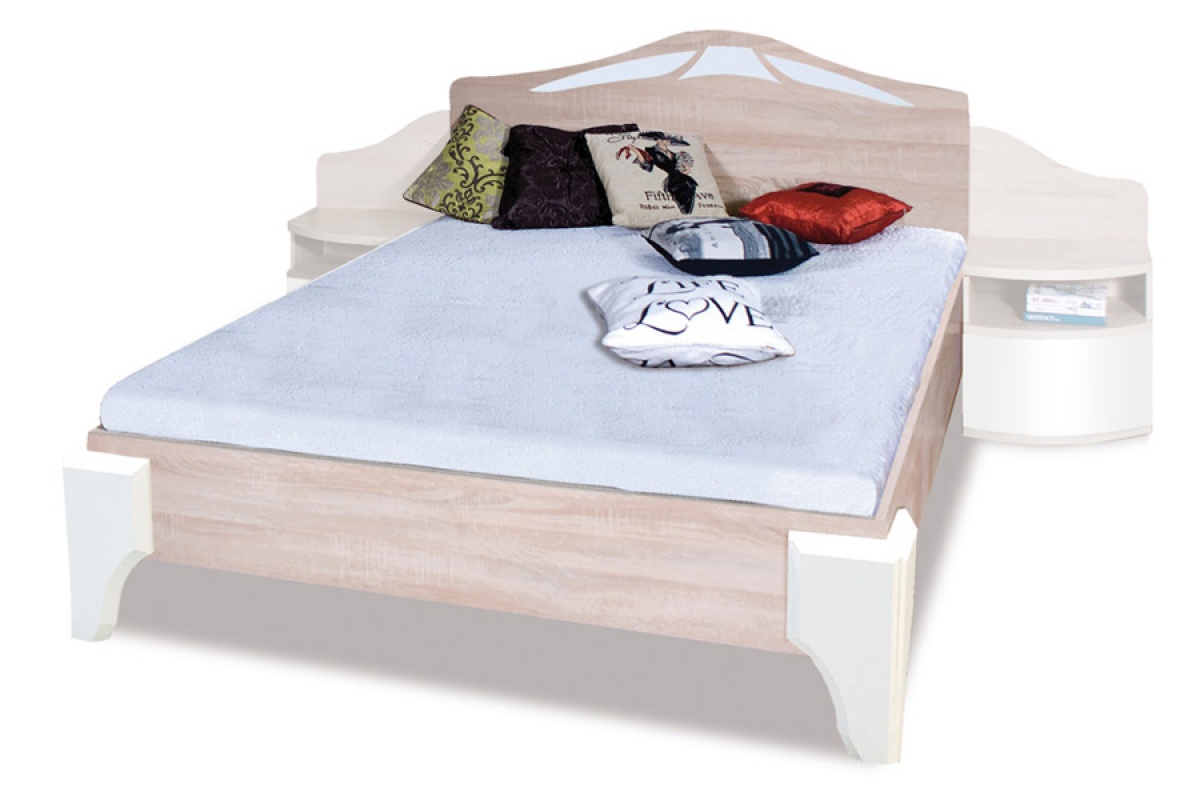 Postel je vyrobena z kvalitního lamina v barvě dub sonoma, nohy postele v dezénu bílá lesk. Čelo postele je čalouněné. Postel se dodává s roštem bez matrace. Zboží je dodáváno v demontu.