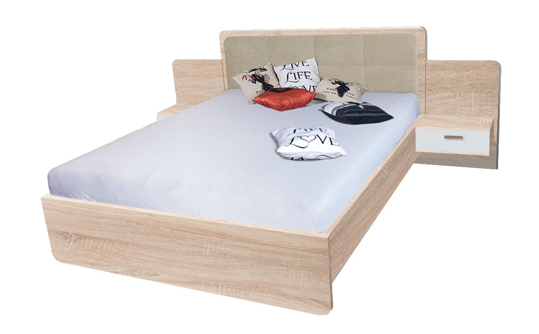 Postel EFFECT EF2L je vyrobena z kvalitního lamina v barvě dub sonoma. Součástí postele jsou noční stolky, čela zásuvek jsou v dezénu bílá andersen. Šířka postele bez nočních stolků je 165 cm, s nočními stolky 275 cm. Čelo postele je čalouněné. Postel se dodává s roštem bez matrace. Zboží je dodáváno v demontu.
