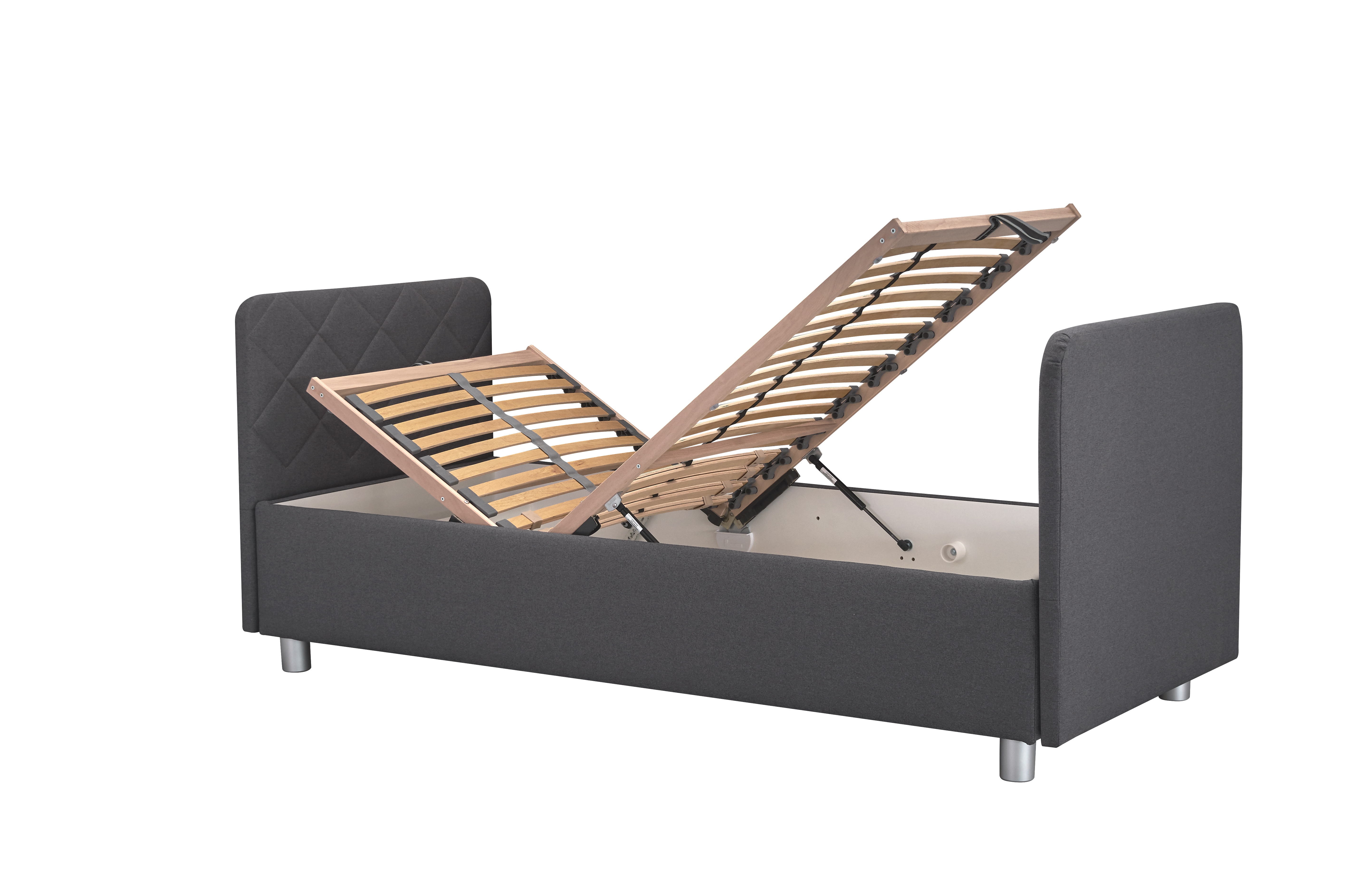 Lůžko s polohovacím lamelovým roštem P 12 s mechanickým polohováním hlavy (7 poloh) a nohou ( 1 poloha). Rošt má 28 lamel ve výkyvných kaučukových pouzdrech s popruhem proti přetížení. Postel je dodávána včetně matrace Nelly. Úložný prostor lůžka se otvírá za pomocí plynových pístů od nohou. Maximální doporučená nosnost 110 kg. Výška lehací plochy 53 cm.