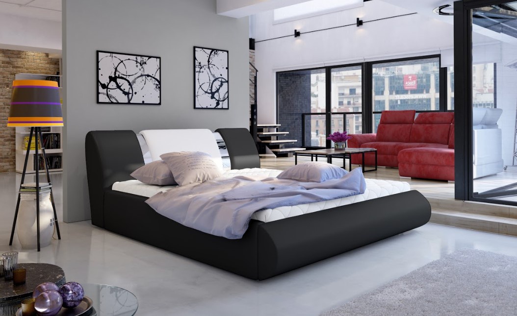 Elegantní lůžko má čalouněný korpus i čelo postele, které je polstrované měkkou pružnou pěnou T25. Čalounění postele je odolné proti oděru a příjemné na dotek. Pozornost k detailům a jemným dekoracím ve formě chromovaných pruhů a kombinací kontrastních barev čela dodá posteli další kouzlo. Mimo to má postel úložný prostor, kde můžete uskladnit např. ložní prádlo. Široká nabídka barev a druhů čalounění zajistí, že si každý vybere tu pravou variantu do svého interiéru. Postel neobsahuje matraci. Každý uživatel proto může libovolně přizpůsobit typ matrace svým vlastním preferencím. Potahová látka jako na hlavním obrázku - černá eko kůže/bílá eko kůže.