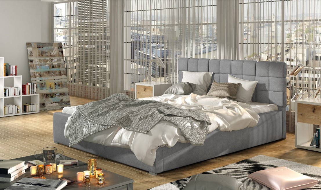 Elegantní lůžko má čalouněný korpus i čelo postele, které je polstrované měkkou pružnou pěnou T25 a ozdobně sešité z čtverců. Čalounění postele je odolné proti oděru a příjemné na dotek. Široká nabídka barev a druhů čalounění zajistí, že si každý vybere tu pravou variantu do svého interiéru. Postel disponuje kovovým roštem a plynovým zdvihacím mechanismem umožňujícím intuitivní a bezproblémové zvedání horní části postele, aby bylo možné využít prostorný kontejner pro ložní prádlo umístěný pod výklopným roštem. Postel neobsahuje matraci. Každý uživatel proto může libovolně přizpůsobit typ matrace svým vlastním preferencím. Potahová látka jako na hlavním obrázku - šedá látka.