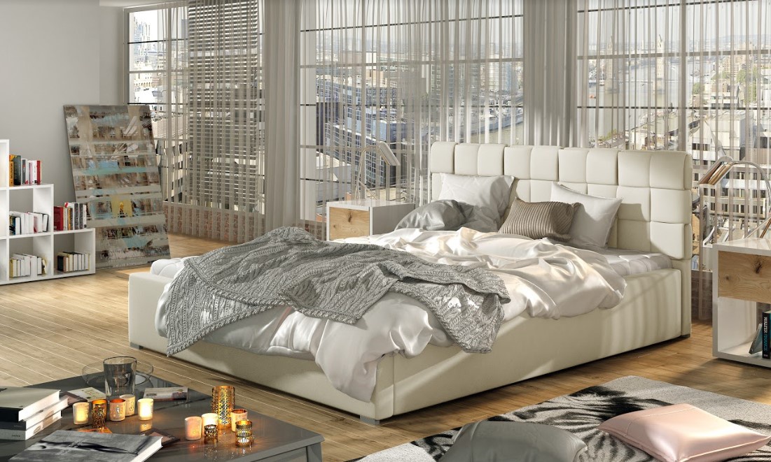 Elegantní lůžko má čalouněný korpus i čelo postele, které je polstrované měkkou pružnou pěnou T25 a ozdobně sešité z čtverců. Čalounění postele je odolné proti oděru a příjemné na dotek. Široká nabídka barev a druhů čalounění zajistí, že si každý vybere tu pravou variantu do svého interiéru. Postel disponuje kovovým roštem a plynovým zdvihacím mechanismem umožňujícím intuitivní a bezproblémové zvedání horní části postele, aby bylo možné využít prostorný kontejner pro ložní prádlo umístěný pod výklopným roštem. Postel neobsahuje matraci. Každý uživatel proto může libovolně přizpůsobit typ matrace svým vlastním preferencím. Potahová látka jako na hlavním obrázku - krémová eko kůže.