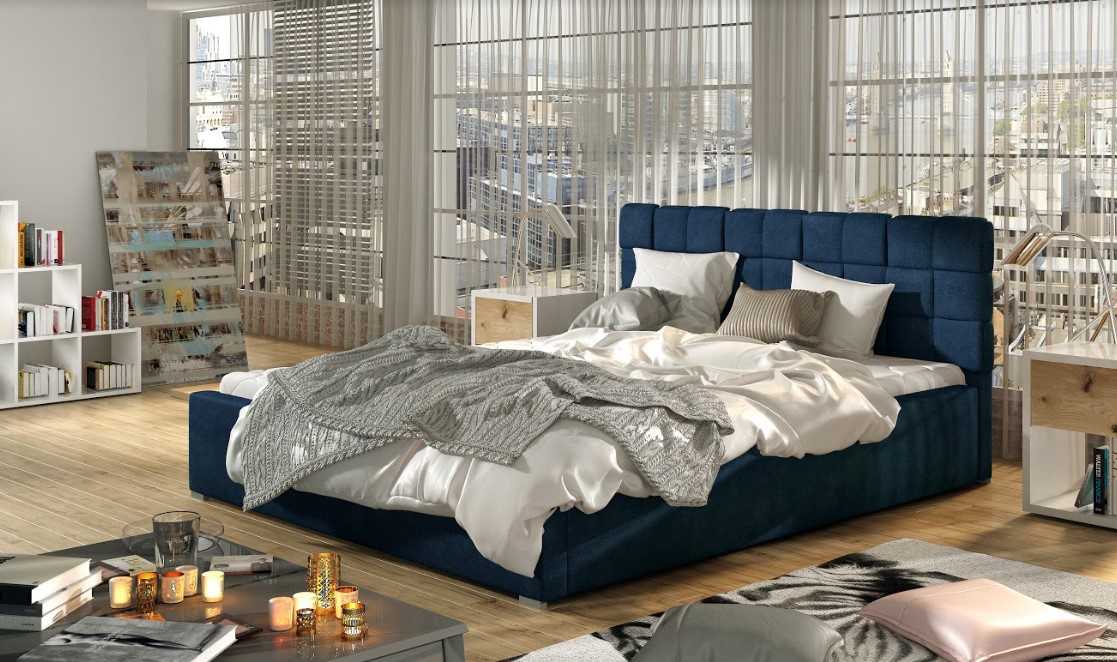 Elegantní lůžko má čalouněný korpus i čelo postele, které je polstrované měkkou pružnou pěnou T25 a ozdobně sešité z čtverců. Čalounění postele je odolné proti oděru a příjemné na dotek. Široká nabídka barev a druhů čalounění zajistí, že si každý vybere tu pravou variantu do svého interiéru. Postel disponuje kovovým roštem a plynovým zdvihacím mechanismem umožňujícím intuitivní a bezproblémové zvedání horní části postele, aby bylo možné využít prostorný kontejner pro ložní prádlo umístěný pod výklopným roštem. Postel neobsahuje matraci. Každý uživatel proto může libovolně přizpůsobit typ matrace svým vlastním preferencím. Potahová látka jako na hlavním obrázku - modrá látka.