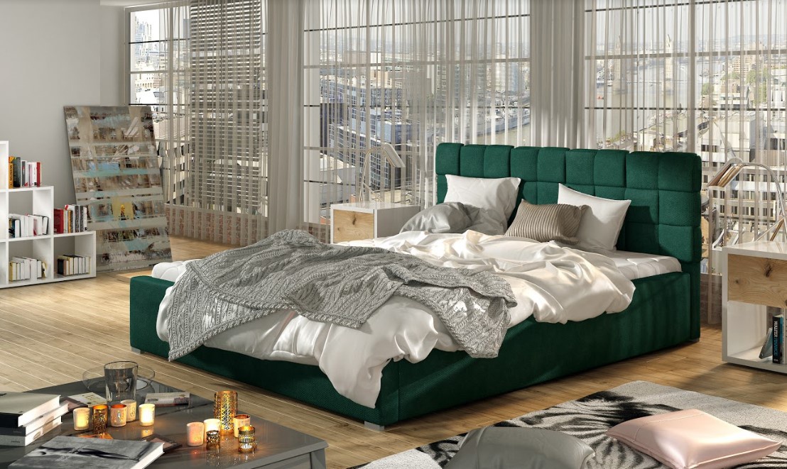 Elegantní lůžko má čalouněný korpus i čelo postele, které je polstrované měkkou pružnou pěnou T25 a ozdobně sešité z čtverců. Čalounění postele je odolné proti oděru a příjemné na dotek. Široká nabídka barev a druhů čalounění zajistí, že si každý vybere tu pravou variantu do svého interiéru. Postel disponuje kovovým roštem a plynovým zdvihacím mechanismem umožňujícím intuitivní a bezproblémové zvedání horní části postele, aby bylo možné využít prostorný kontejner pro ložní prádlo umístěný pod výklopným roštem. Postel neobsahuje matraci. Každý uživatel proto může libovolně přizpůsobit typ matrace svým vlastním preferencím. Potahová látka jako na hlavním obrázku - tmavě zelená látka.