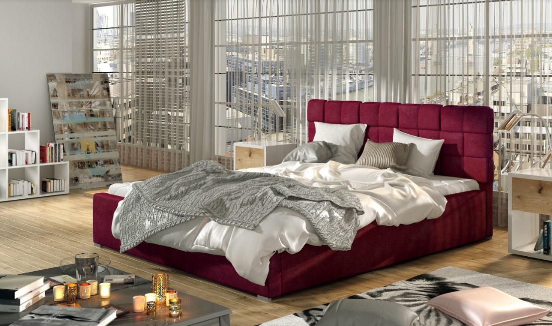 Elegantní lůžko má čalouněný korpus i čelo postele, které je polstrované měkkou pružnou pěnou T25 a ozdobně sešité z čtverců. Čalounění postele je odolné proti oděru a příjemné na dotek. Široká nabídka barev a druhů čalounění zajistí, že si každý vybere tu pravou variantu do svého interiéru. Postel disponuje kovovým roštem a plynovým zdvihacím mechanismem umožňujícím intuitivní a bezproblémové zvedání horní části postele, aby bylo možné využít prostorný kontejner pro ložní prádlo umístěný pod výklopným roštem. Postel neobsahuje matraci. Každý uživatel proto může libovolně přizpůsobit typ matrace svým vlastním preferencím. Potahová látka jako na hlavním obrázku - vínově červená látka.