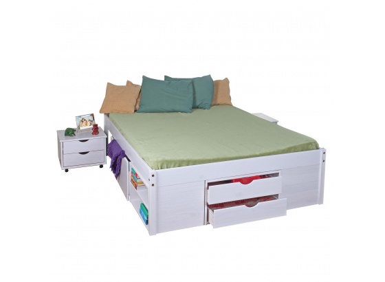 Materiál masiv borovice, barevné provedení bílý lak, praktické úložné prostory pod postelí, výška sedu 44,5 cm, 2 výsuvné noční stolky a rošt (dřevěný laťkový) jsou v ceně, matrace není v ceně, doporučený rozměr matrace 140 × 200 cm (M6) ID20900170 till. Zboží je dodáváno v demontu.