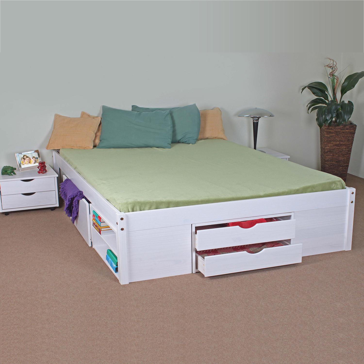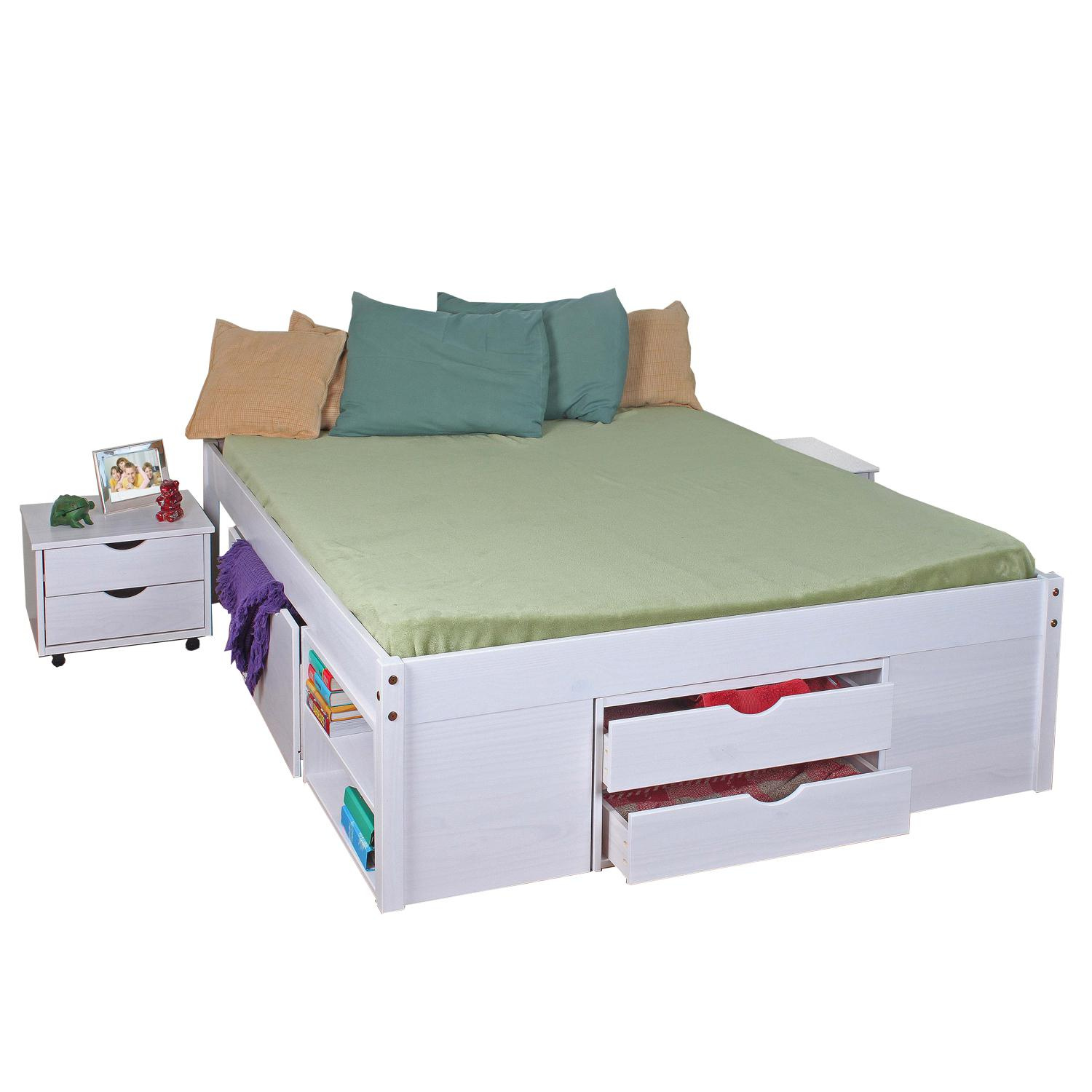 Materiál masiv borovice, barevné provedení bílý lak, praktické úložné prostory pod postelí, výška sedu 44,5 cm, 2 výsuvné noční stolky a rošt (dřevěný laťkový) jsou v ceně, matrace není v ceně doporučený rozměr matrace 160 × 200 cm (M3, M7, M15, M25, M27, M29) ID20900175 till. Zboží dodáváme v demontu.