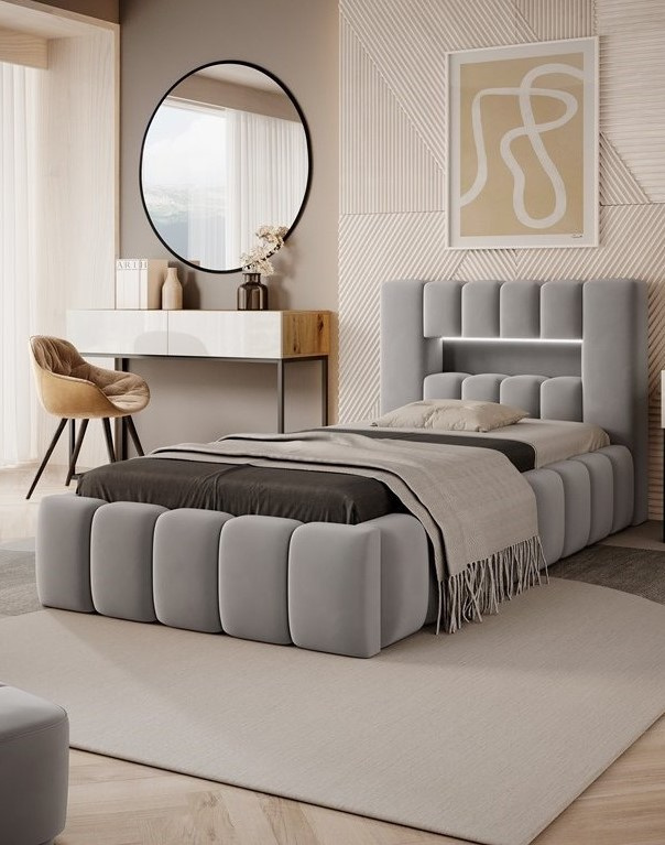 Velmi pohodlná, měkká a originální postel Lamica v barevném provedení Nube 03 se skládá z dřevěného korpusu a roštu z dřevěného rámu s plynovým zdvihem, díky čemuž získáte úložný prostor na lůžkoviny, který lze velmi snadno a tiše, bez použití větší síly, zvednout. Estetické vjemy umocňuje dlouhé, objemné prošívání. Opěrka hlavy je s LED osvětlením, díky které bude odpočinek ještě příjemnější. Postel je dodávána bez matrace. Nosnost postele 120 kg. Zboží dodáváme v demontu.