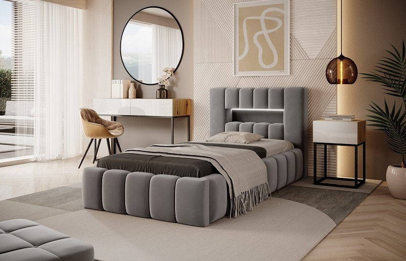 Velmi pohodlná, měkká a originální postel Lamica v barevném provedení Nube 04 se skládá z dřevěného korpusu a roštu z kovového rámu s plynovým zdvihem, díky čemuž získáte úložný prostor na lůžkoviny, který lze velmi snadno a tiše, bez použití větší síly, zvednout. Estetické vjemy umocňuje dlouhé, objemné prošívání. Opěrka hlavy je s LED osvětlením, díky které bude odpočinek ještě příjemnější. Postel je dodávána bez matrace. Nosnost postele 120 kg. Zboží dodáváme v demontu.