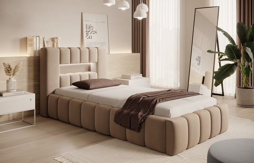 Velmi pohodlná, měkká a originální postel Lamica v barevném provedení Nube 20 se skládá z dřevěného korpusu a roštu z dřevěného rámu s plynovým zdvihem, díky čemuž získáte úložný prostor na lůžkoviny, který lze velmi snadno a tiše, bez použití větší síly, zvednout. Estetické vjemy umocňuje dlouhé, objemné prošívání. Opěrka hlavy je s LED osvětlením, díky které bude odpočinek ještě příjemnější. Postel je dodávána bez matrace. Nosnost postele 120 kg. Zboží dodáváme v demontu.