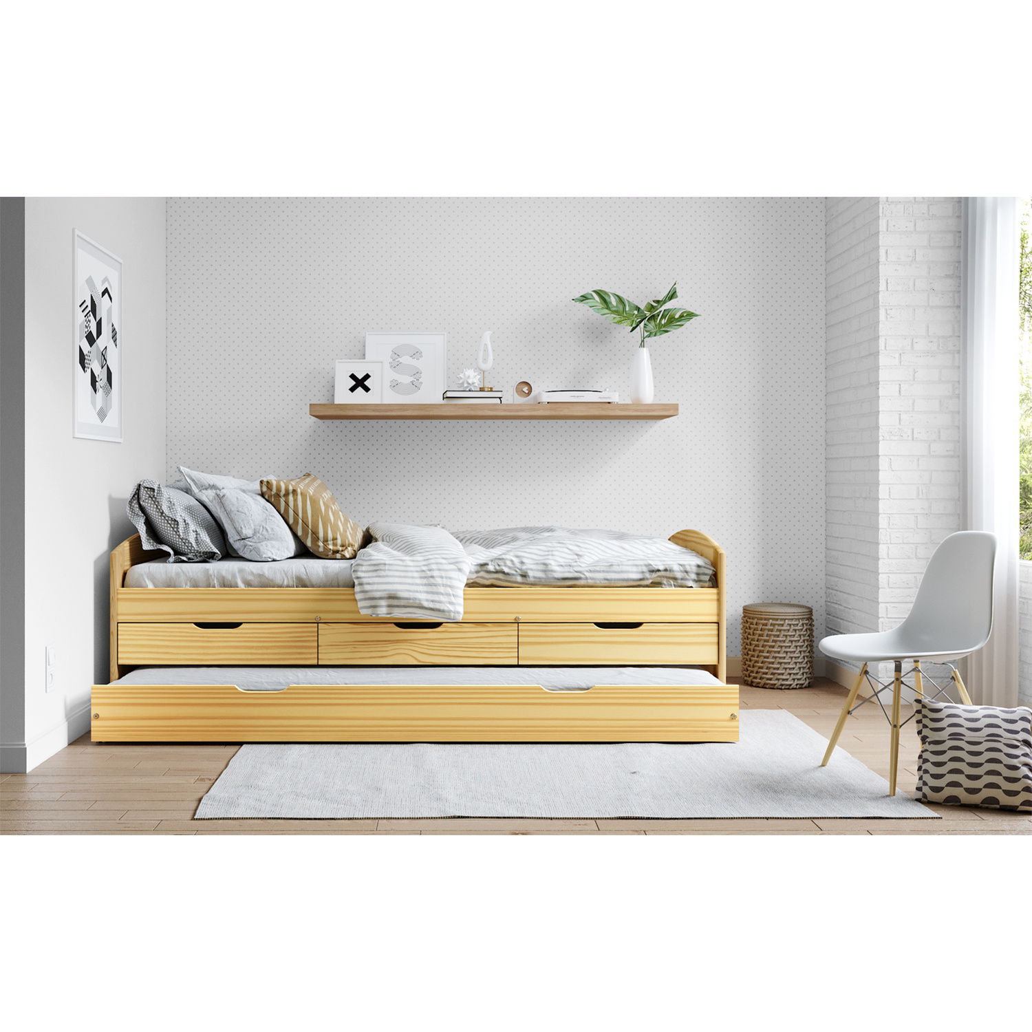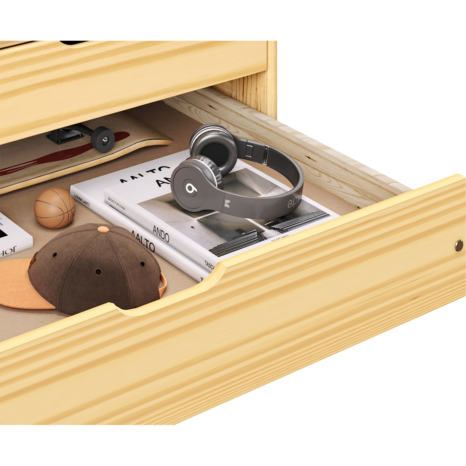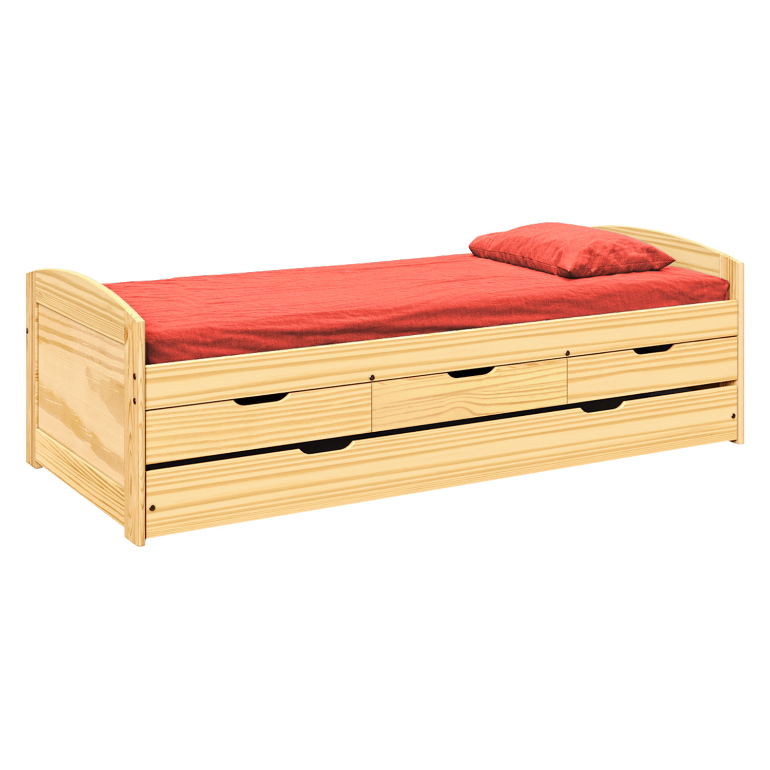 Materiál masiv borovice, lakované provedení, výška sedu 52 cm, praktické úložné prostory pod postelí (3 zásuvky a výsuv) jsou v ceně, cena včetně roštu (dřevěný laťkový) bez matrace, doporučený rozměr matrace 90 × 200 cm, výsuv možno po doplnění o rošt užívat také jako přistýlku (rošt nutno doobjednat zvlášť, doporučená výška matrace do 10 cm). Zboží je dodáváno v demontu.