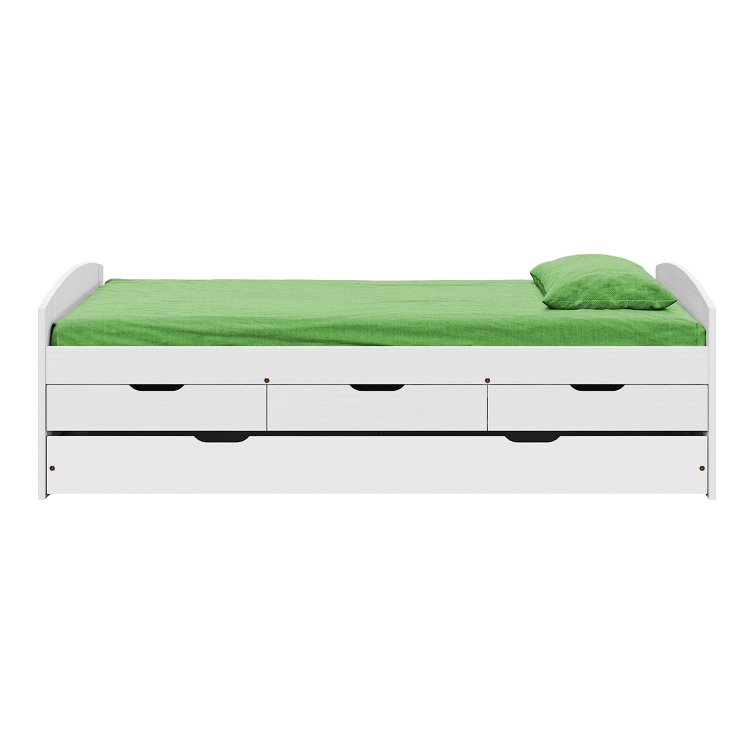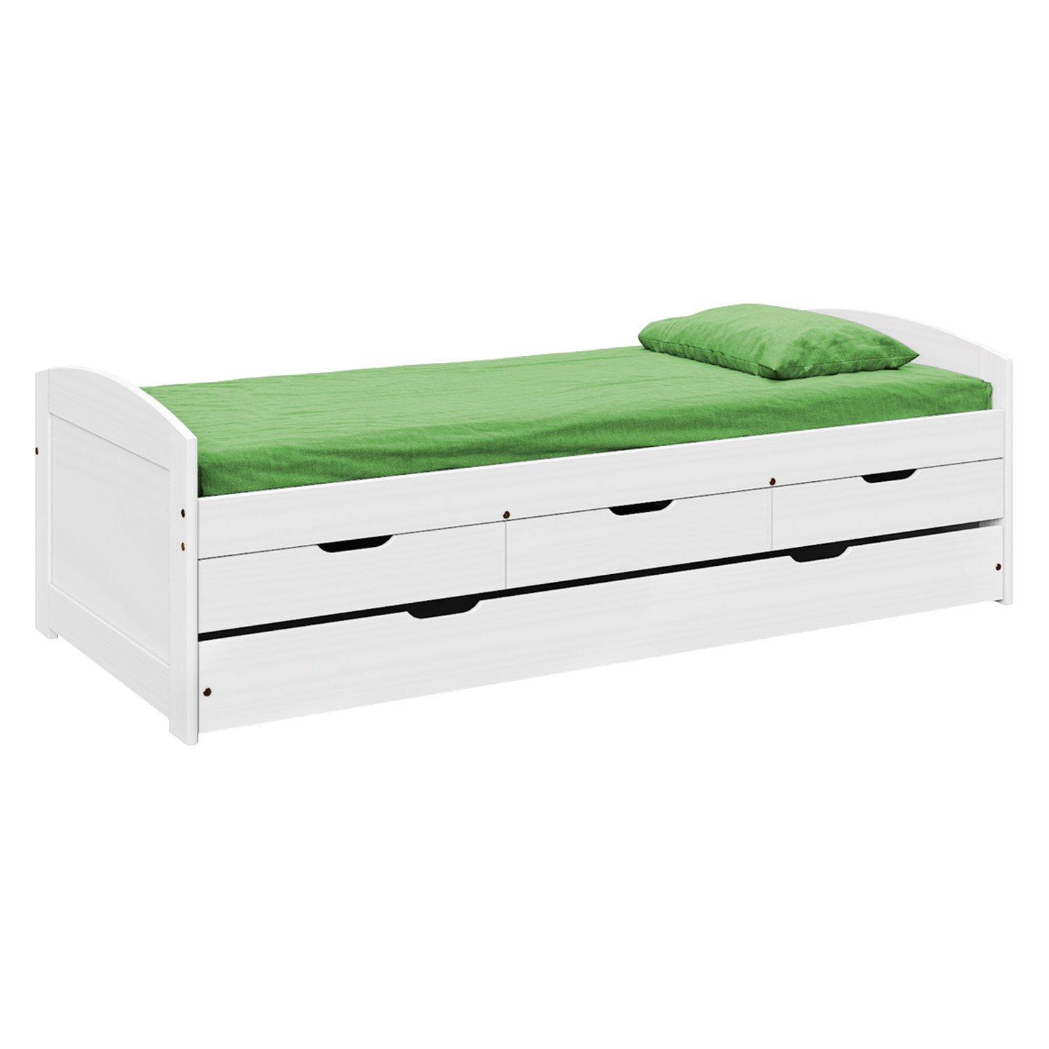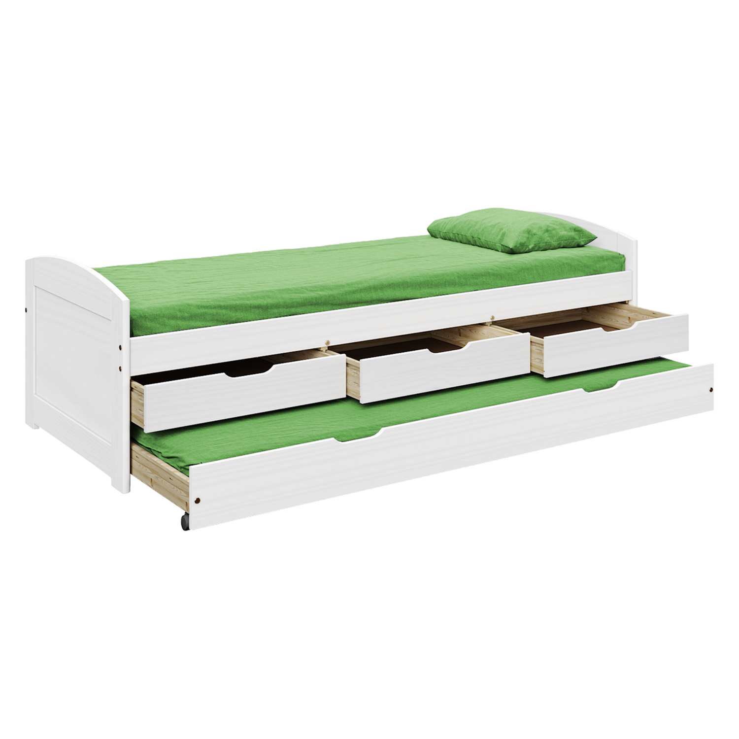 Materiál masiv borovice, barevné provedení bílý lak, model ULLI, výška sedu 52 cm, praktické úložné prostory pod postelí (3 zásuvky a výsuv) jsou v ceně, cena včetně roštu (dřevěný laťkový) bez matrace, doporučený rozměr matrace 90 × 200 cm, výsuv možno po doplnění o rošt užívat také jako přistýlku (rošt nutno doobjednat zvlášť, doporučená výška matrace do 10 cm). Zboží je dodáváno v demontu.