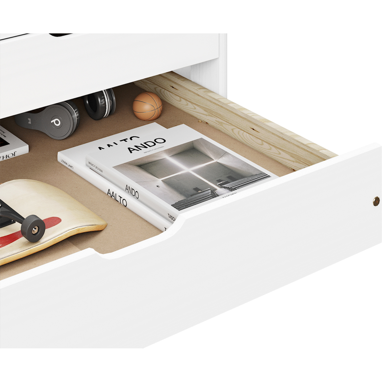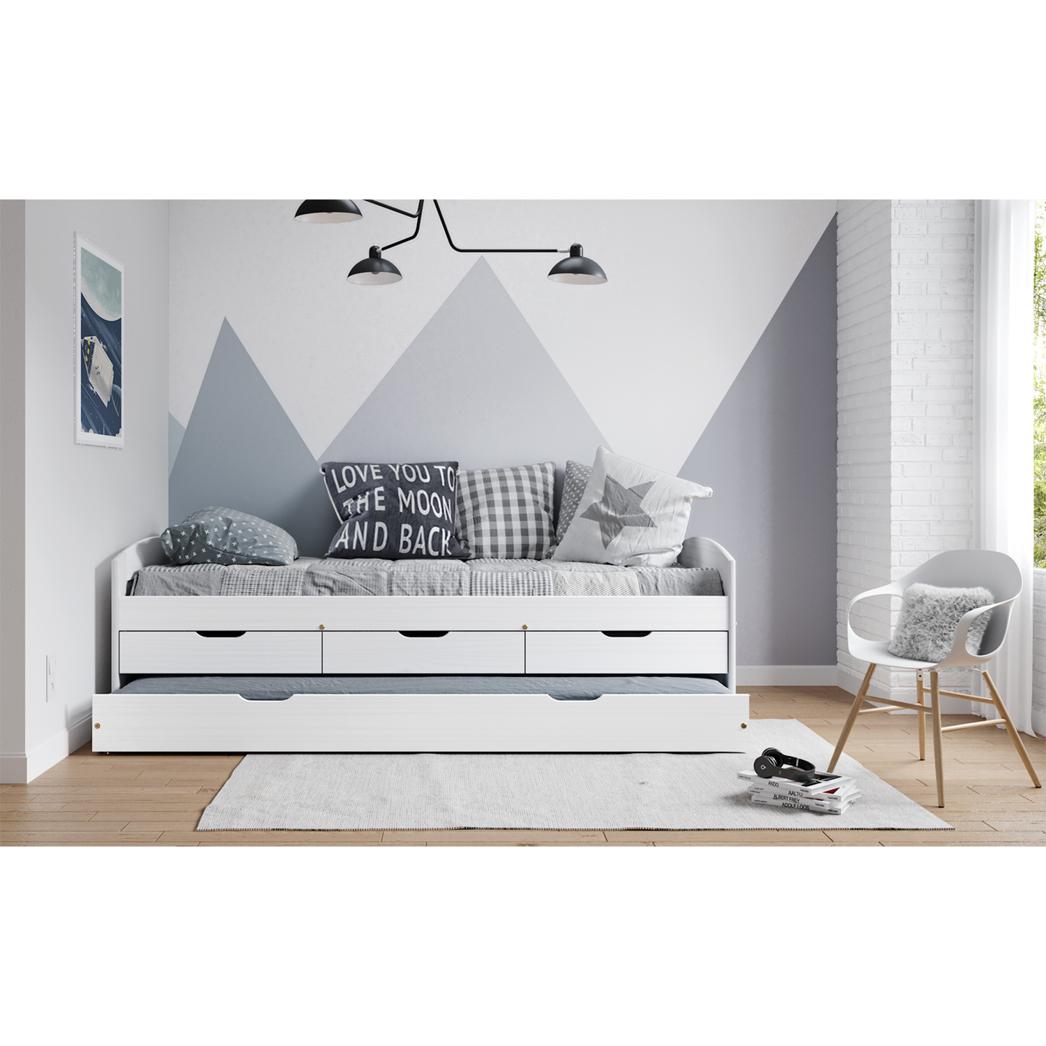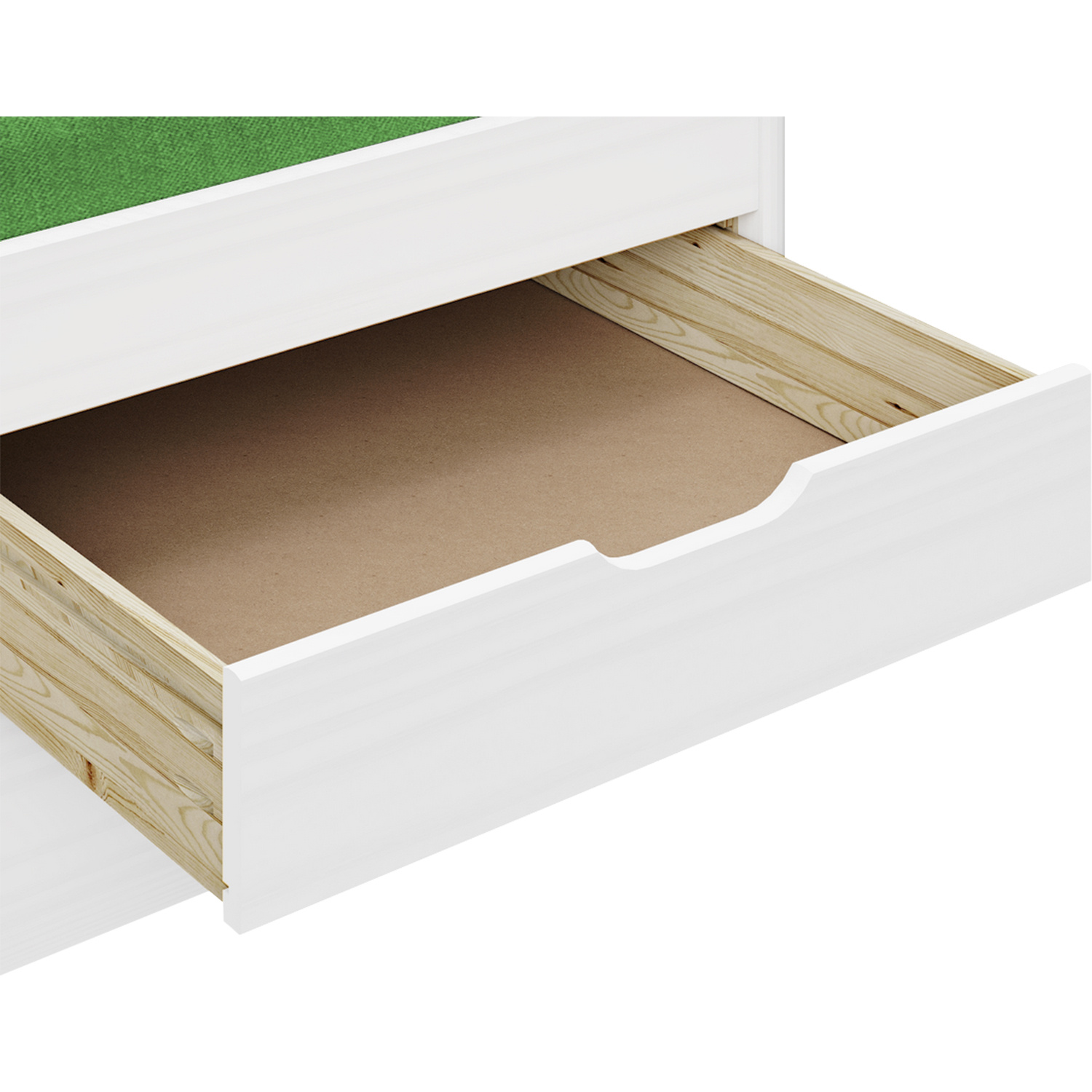 Materiál masiv borovice, barevné provedení bílý lak, model ULLI, výška sedu 52 cm, praktické úložné prostory pod postelí (3 zásuvky a výsuv) jsou v ceně, cena včetně roštu (dřevěný laťkový) bez matrace, doporučený rozměr matrace 90 × 200 cm, výsuv možno po doplnění o rošt užívat také jako přistýlku (rošt nutno doobjednat zvlášť, doporučená výška matrace do 10 cm). Zboží je dodáváno v demontu.