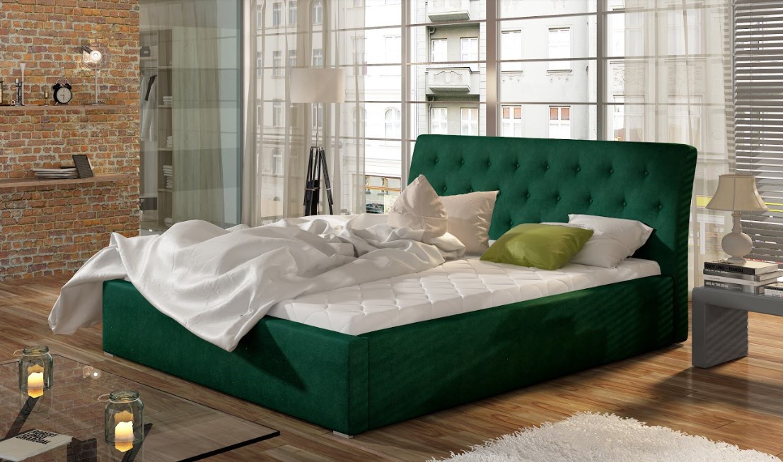 Elegantní lůžko MILANO má čalouněný korpus i čelo postele, která jsou polstrovaná měkkou pružnou pěnou T25. Čalounění postele je odolné proti oděru a příjemné na dotek. Široká nabídka barev a druhů čalounění zajistí, že si každý vybere tu pravou variantu do svého interiéru. Čelo postele je navíc doplněno knoflíky a jemným prošíváním. Postel disponuje kovovým roštem a plynovým zdvihacím mechanismem umožňujícím intuitivní a bezproblémové zvedání horní části postele, aby bylo možné využít prostorný kontejner pro ložní prádlo umístěný pod výklopným roštem. Postel neobsahuje matraci. Každý uživatel proto může libovolně přizpůsobit typ matrace svým vlastním preferencím. Potahová látka jako na hlavním obrázku - tmavozelená.