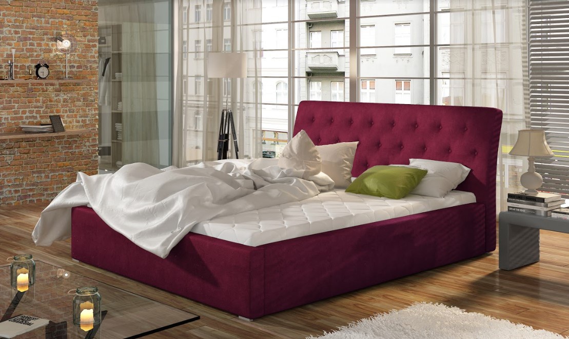 Elegantní lůžko MILANO má čalouněný korpus i čelo postele, která jsou polstrovaná měkkou pružnou pěnou T25. Čalounění postele je odolné proti oděru a příjemné na dotek. Široká nabídka barev a druhů čalounění zajistí, že si každý vybere tu pravou variantu do svého interiéru. Čelo postele je navíc doplněno knoflíky a jemným prošíváním. Postel disponuje kovovým roštem a plynovým zdvihacím mechanismem umožňujícím intuitivní a bezproblémové zvedání horní části postele, aby bylo možné využít prostorný kontejner pro ložní prádlo umístěný pod výklopným roštem. Postel neobsahuje matraci. Každý uživatel proto může libovolně přizpůsobit typ matrace svým vlastním preferencím. Potahová látka jako na hlavním obrázku - vínově červená.