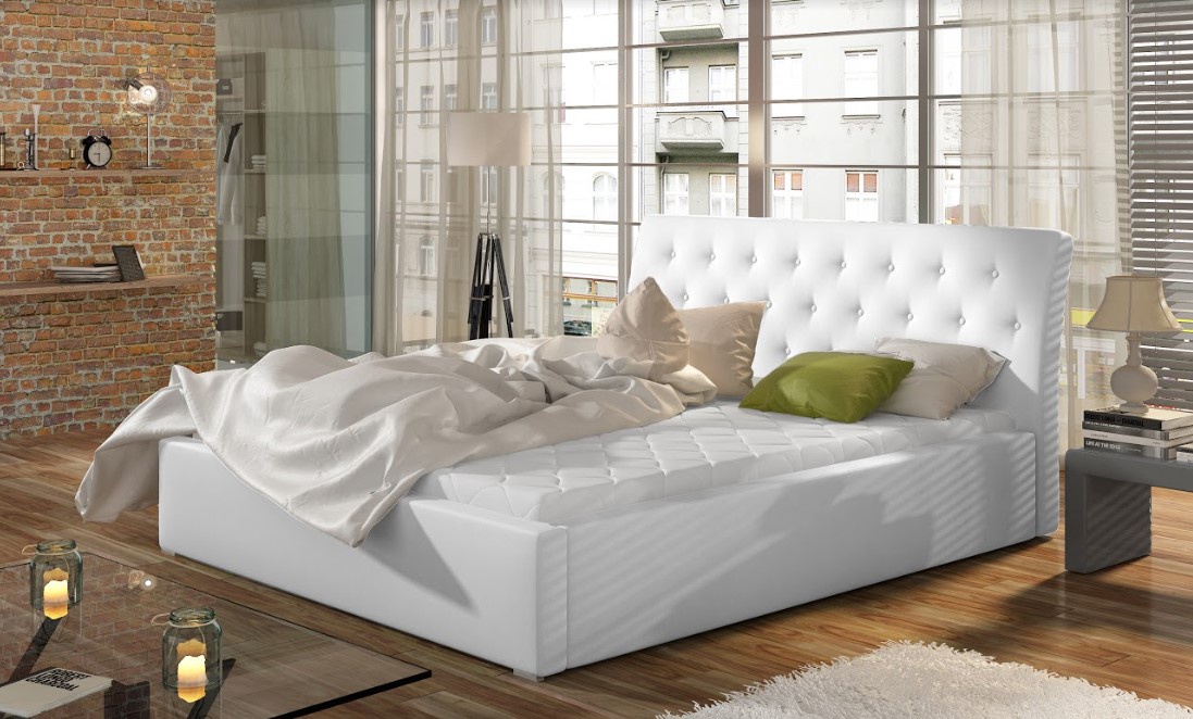 Elegantní lůžko MILANO má čalouněný korpus i čelo postele, která jsou polstrovaná měkkou pružnou pěnou T25. Čalounění postele je odolné proti oděru a příjemné na dotek. Široká nabídka barev a druhů čalounění zajistí, že si každý vybere tu pravou variantu do svého interiéru. Čelo postele je navíc doplněno knoflíky a jemným prošíváním. Postel disponuje kovovým roštem a plynovým zdvihacím mechanismem umožňujícím intuitivní a bezproblémové zvedání horní části postele, aby bylo možné využít prostorný kontejner pro ložní prádlo umístěný pod výklopným roštem. Postel neobsahuje matraci. Každý uživatel proto může libovolně přizpůsobit typ matrace svým vlastním preferencím. Potahová látka jako na hlavním obrázku - bílá eko kůže.