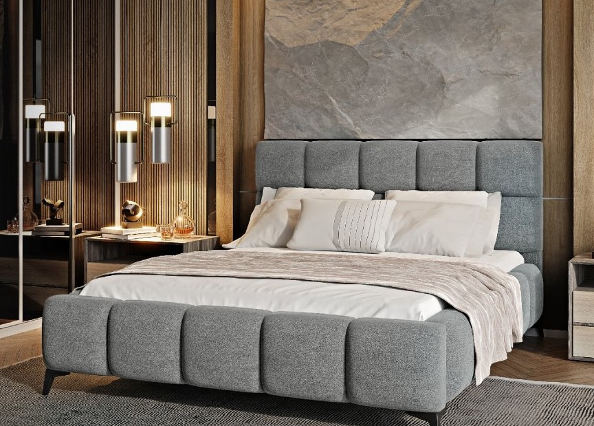 Čalouněná postel v barevném provedení Gojo 05. Vysoké čelo i boční části postele jsou vybaveny pěnou, která je podélně protažená a zdobená podélným prošitím. Postel má 13,5 cm vysoké ocelové nohy. Pod výklopným roštem se nachází úložný prostor. Postel je dodávána bez matrace. Zboží dodáváme v demontu.