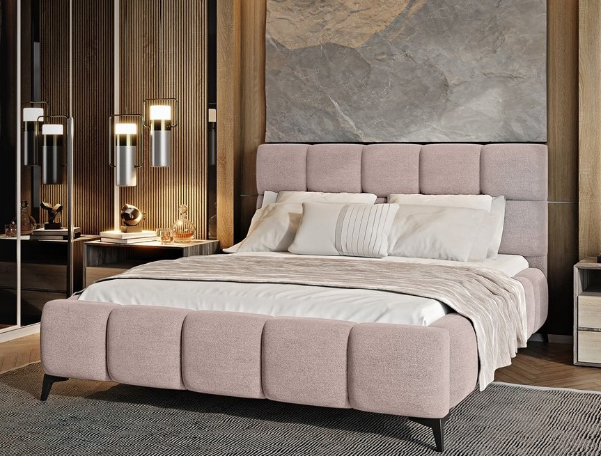 Čalouněná postel v barevném provedení Gojo 101. Vysoké čelo i boční části postele jsou vybaveny pěnou, která je podélně protažená a zdobená podélným prošitím. Postel má 13,5 cm vysoké ocelové nohy. Pod výklopným roštem se nachází úložný prostor. Postel je dodávána bez matrace. Zboží dodáváme v demontu.