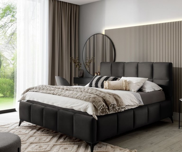 Čalouněná postel v barevném provedení Loco 05. Vysoké čelo i boční části postele jsou vybaveny pěnou, která je podélně protažená a zdobená podélným prošitím. Postel má 13,5 cm vysoké ocelové nohy. Pod výklopným roštem se nachází úložný prostor. Postel je dodávána bez matrace. Zboží dodáváme v demontu.