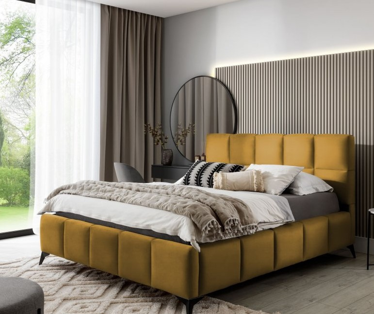 Čalouněná postel v barevném provedení Loco 45. Vysoké čelo i boční části postele jsou vybaveny pěnou, která je podélně protažená a zdobená podélným prošitím. Postel má 13,5 cm vysoké ocelové nohy. Pod výklopným roštem se nachází úložný prostor. Postel je dodávána bez matrace. Zboží dodáváme v demontu.