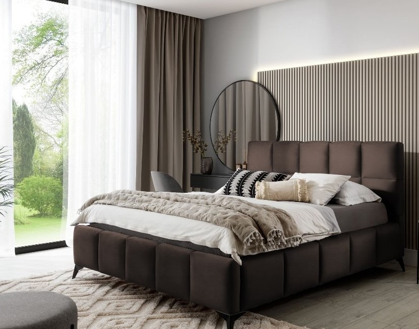 Čalouněná postel v barevném provedení Loco 21. Vysoké čelo i boční části postele jsou vybaveny pěnou, která je podélně protažená a zdobená podélným prošitím. Postel má 13,5 cm vysoké ocelové nohy. Pod výklopným roštem se nachází úložný prostor. Postel je dodávána bez matrace. Zboží dodáváme v demontu.