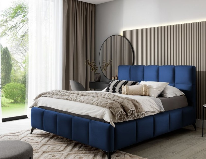 Čalouněná postel v barevném provedení Loco 40. Vysoké čelo i boční části postele jsou vybaveny pěnou, která je podélně protažená a zdobená podélným prošitím. Postel má 13,5 cm vysoké ocelové nohy. Pod výklopným roštem se nachází úložný prostor. Postel je dodávána bez matrace. Zboží dodáváme v demontu.