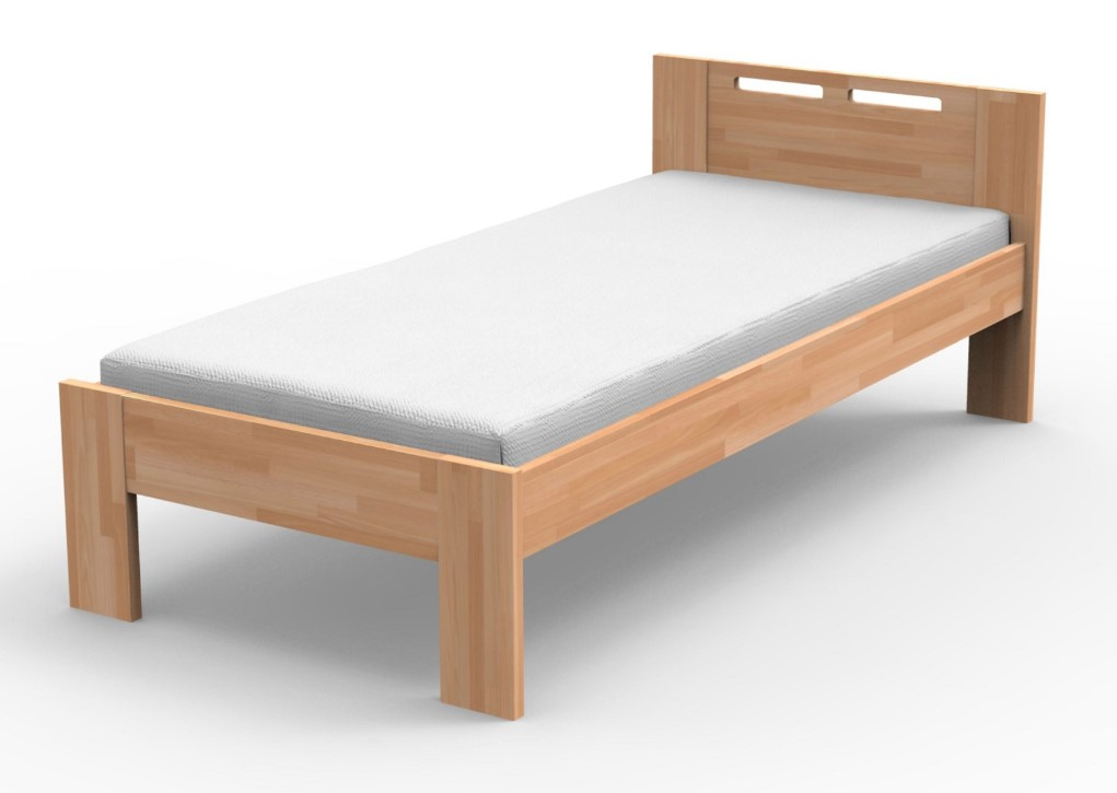 Postel je vyrobena z masivu buk cink (parketový desing) s možností nastavitelného kování. Tloušťka masivu je 27/19 mm, bočnice 27 mm. Výška čela u hlavy 75 cm, po horní hranu bočnice 40 cm. Cena postele je uvedena bez roštu a bez matrace. Postel nabízíme v několika rozměrech. Zboží dodáváme v demontu.