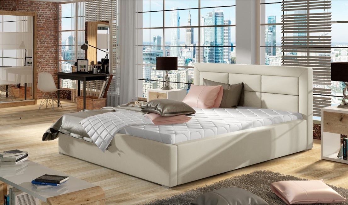 Elegantní lůžko ROSANO má čalouněný korpus i čelo postele, které je polstrované měkkou pružnou pěnou T25 a ozdobně prošité do obdélníků. Čalounění postele je odolné proti oděru a příjemné na dotek. Široká nabídka barev a druhů čalounění zajistí, že si každý vybere tu pravou variantu do svého interiéru. Postel disponuje kovovým roštem a plynovým zdvihacím mechanismem umožňujícím intuitivní a bezproblémové zvedání horní části postele, aby bylo možné využít prostorný kontejner pro ložní prádlo umístěný pod výklopným roštem. Postel neobsahuje matraci. Každý uživatel proto může libovolně přizpůsobit typ matrace svým vlastním preferencím. Potahová látka jako na hlavním obrázku - krémová eko kůže.
